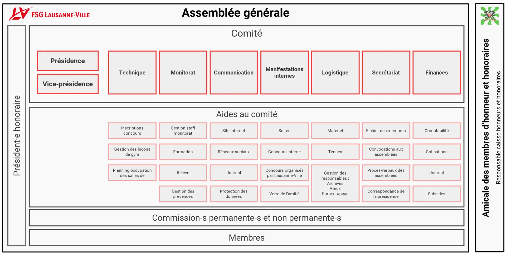 A Lausanne-Ville, nous sommes structurés avec un comité, appuyé par des aides spécialistes dans leur domaines respectifs et des commissionnaires permanents.